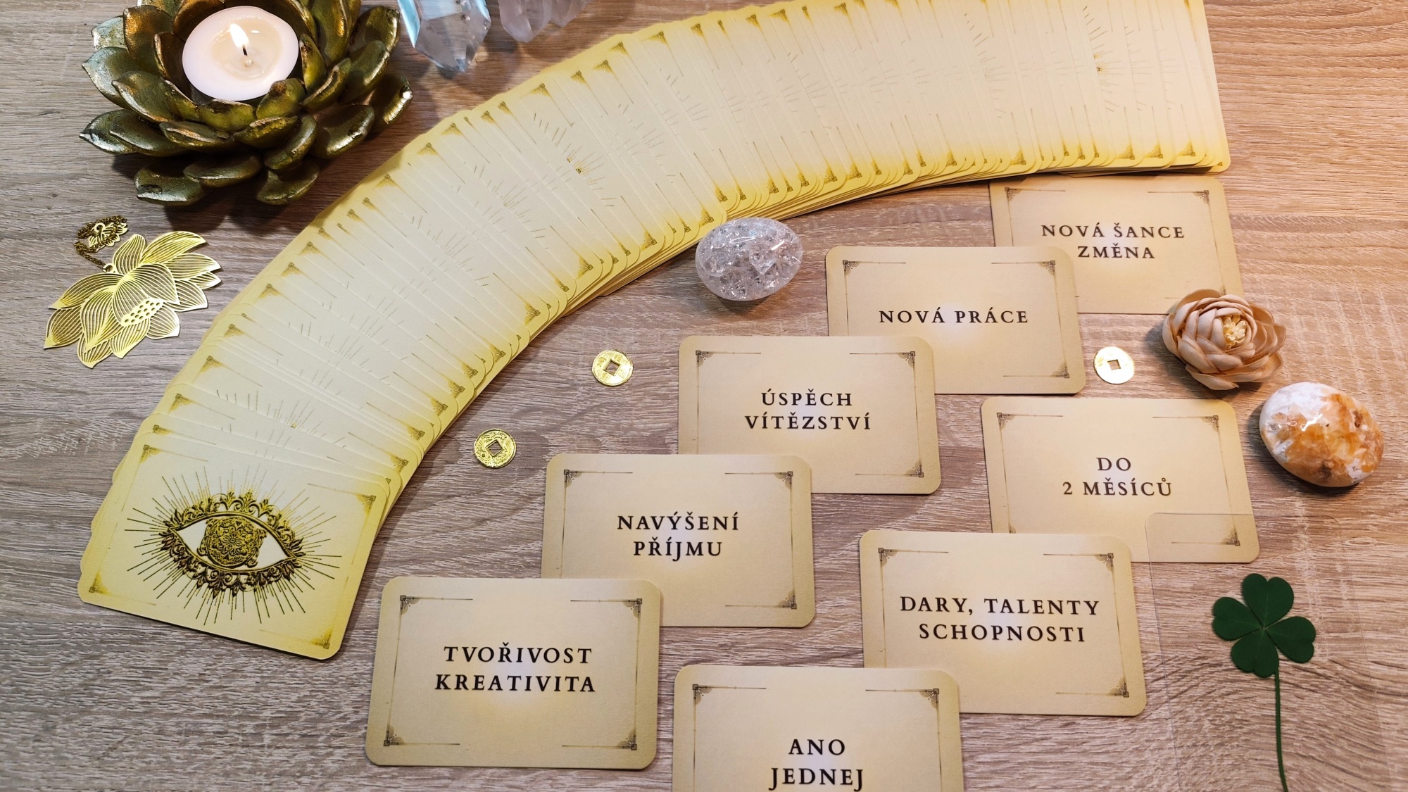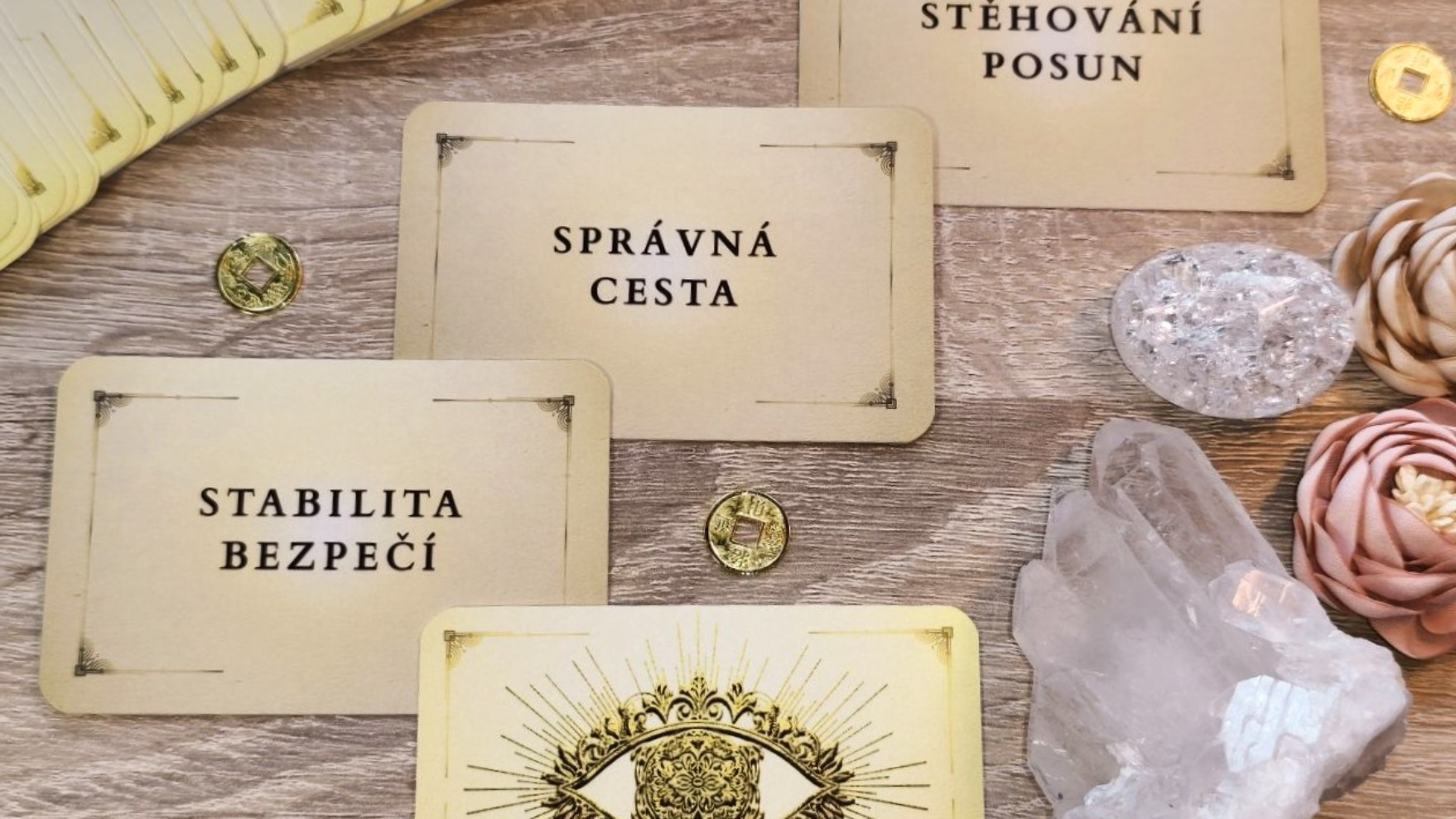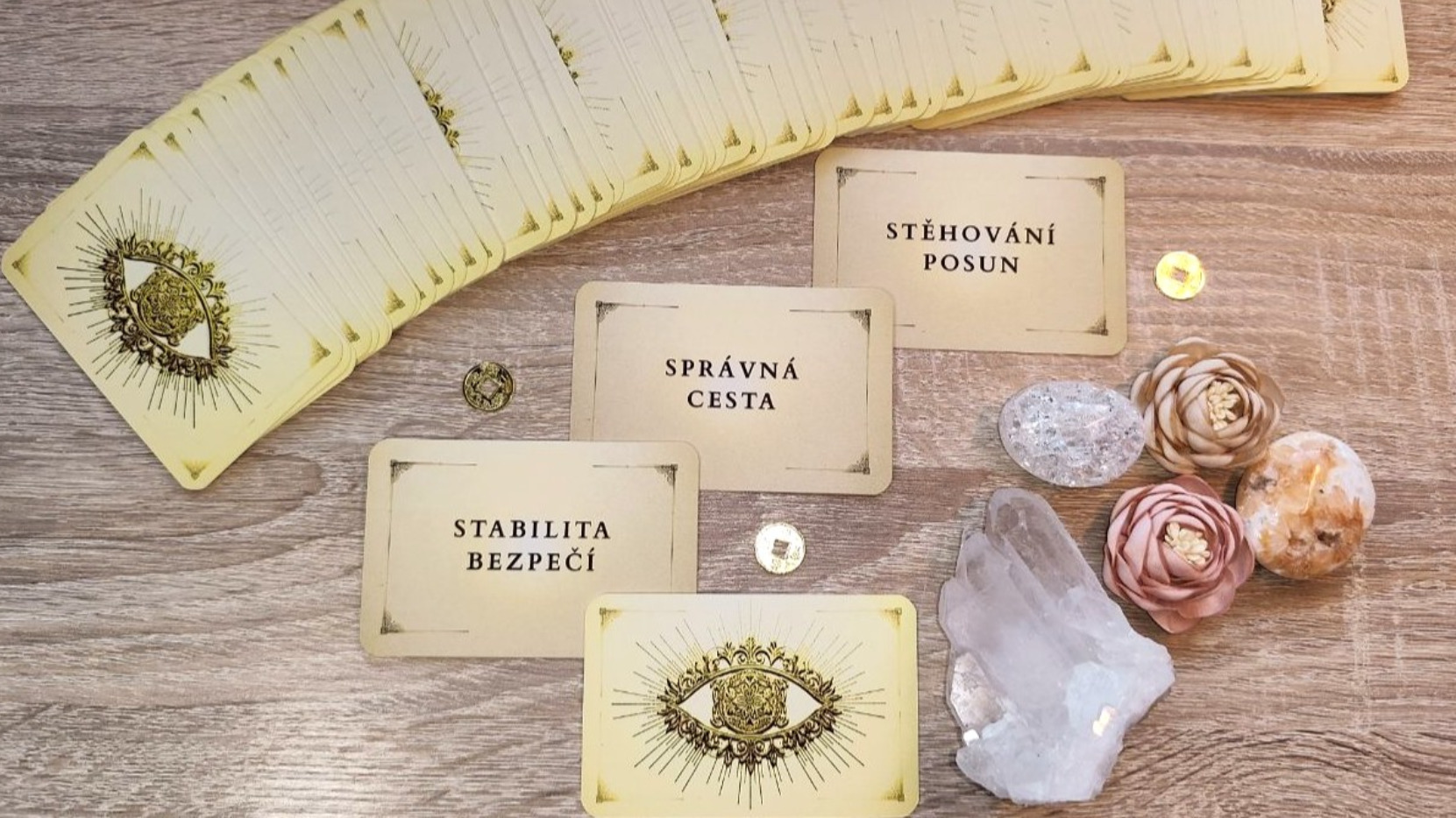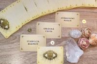 Tyto kartičky jsem původně vytvořila pro sebe. Nápad jsem v sobě nosila dlouho a toužila jsem vytvořit něco vlastního. Práce na nich mě naprosto pohltila – od ladění podoby Zlatého oka, až po intuitivní výběr hesel a slov, která přinášejí jasné odpovědi. Když mi přišly, byla jsem nadšená. Začala jsem je používat v členských výkladech a váš zájem o ně, mě mile překvapil. Proto jsem se rozhodla poslat je dál i k vám :)